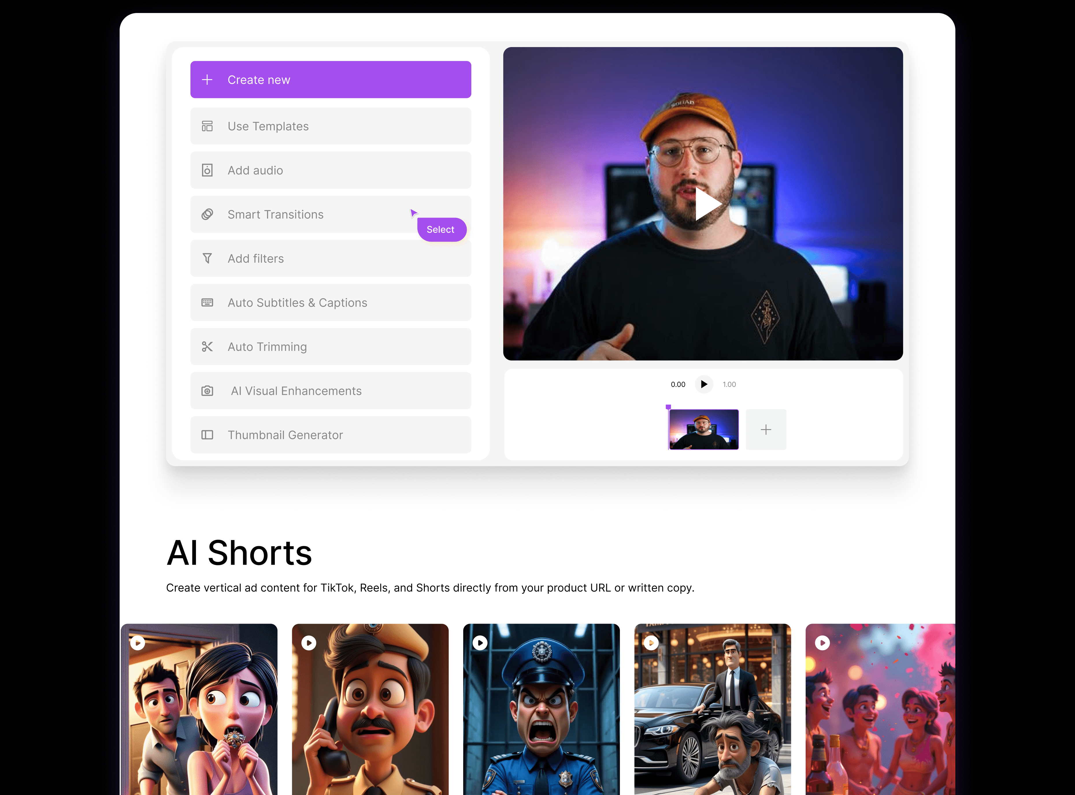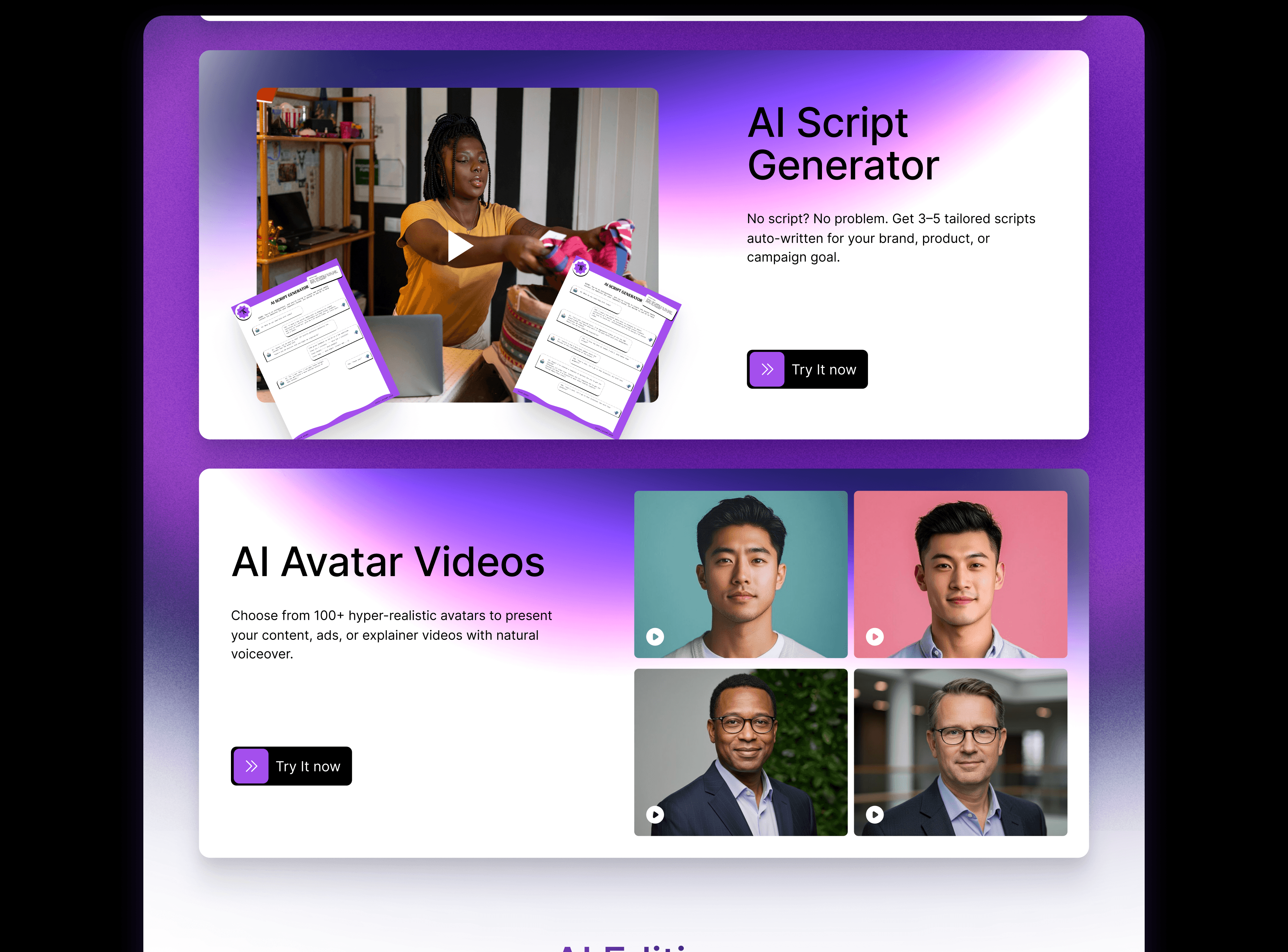 Also each feature from URL to Video, AI Avatar Ads, and Custom Templates, to AI Editing and Shorts was presented through concise messaging and minimal visuals to instantly communicate purpose and impact.